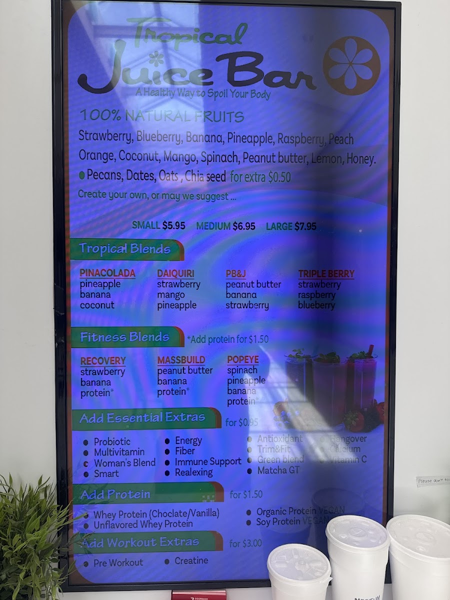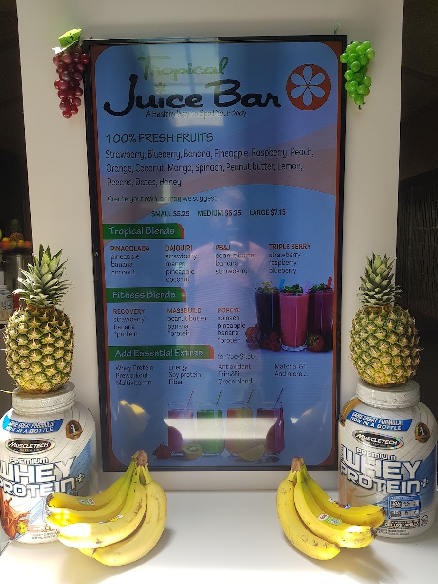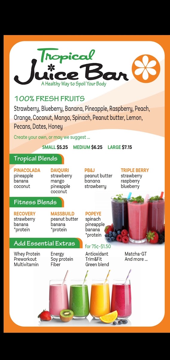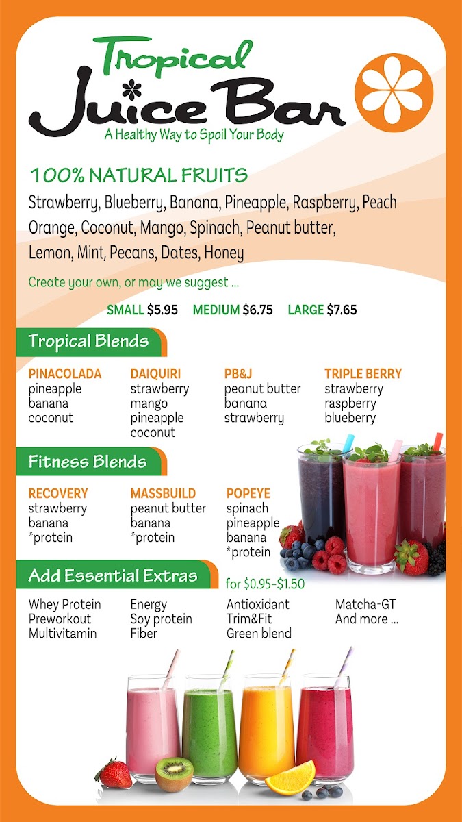 The menu at The Natural Juice Bar offers a variety of fresh, customizable options that cater to different tastes and health goals. For those looking to create their own unique blend, the "Create Your Own" option allows customers to choose from three sizes: Small, Medium, and Large. The Fitness Blends are perfect for anyone focused on boosting their workout recovery, with choices like Popeye, Recovery, and Mass Build. For a tropical flavor, the Tropical Blends offer refreshing drinks such as Daiquiri, PB&J, Pina Colada, and Triple Berry. Each option is crafted with high-quality ingredients, providing both delicious and nutritious choices for those seeking a healthy boost.